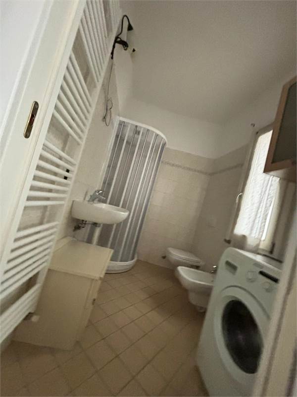 Zona giorno, camera da letto e bagno con box doccia e lavatrice.