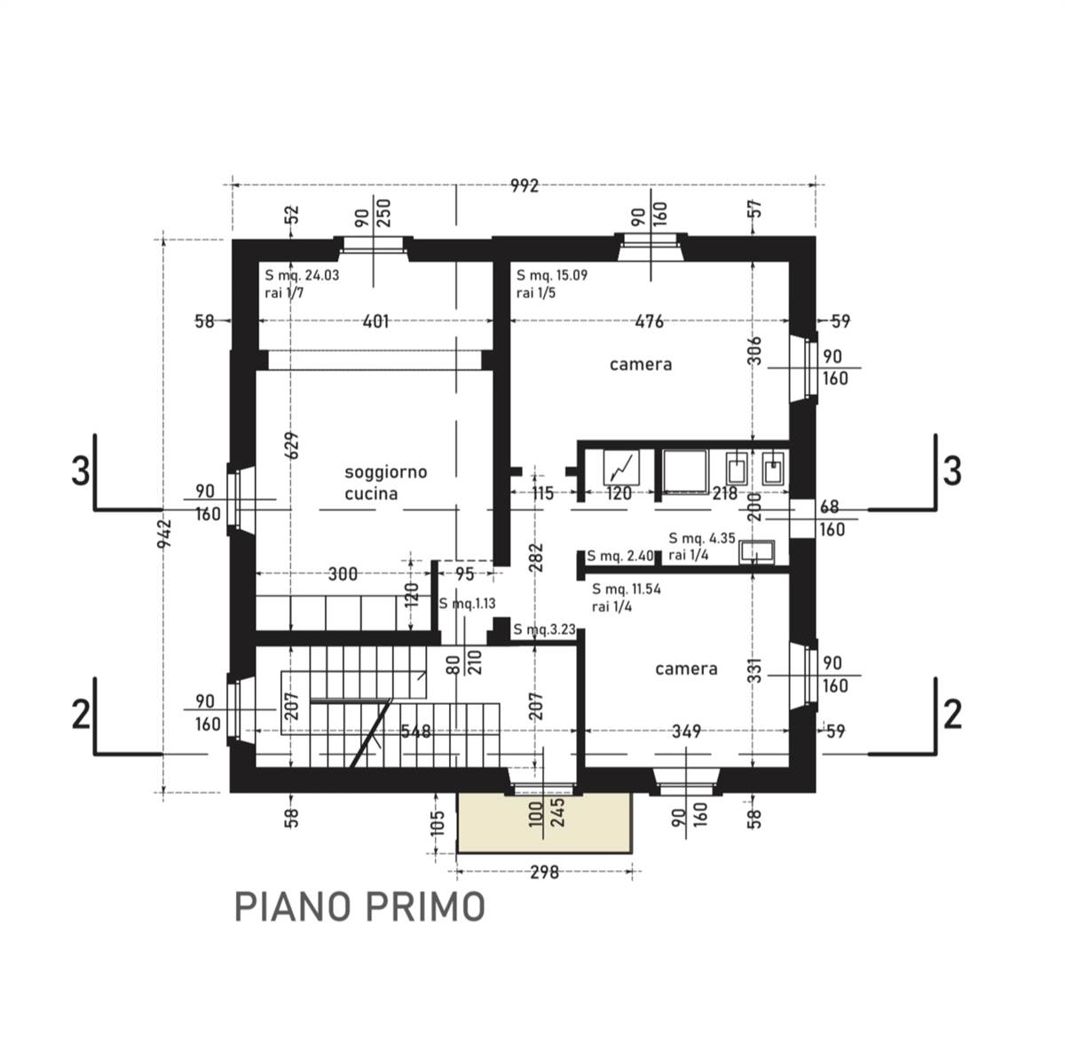Appartamento TRILOCALE sito al 1° piano, composto da ingresso, soggiorno con cucina a vista, disimpegno, due camere, antibagno / lavanderia, bagno con doccia, balcone comune, cantina, due posti auto scoperti interni e BOX DOPPIO.